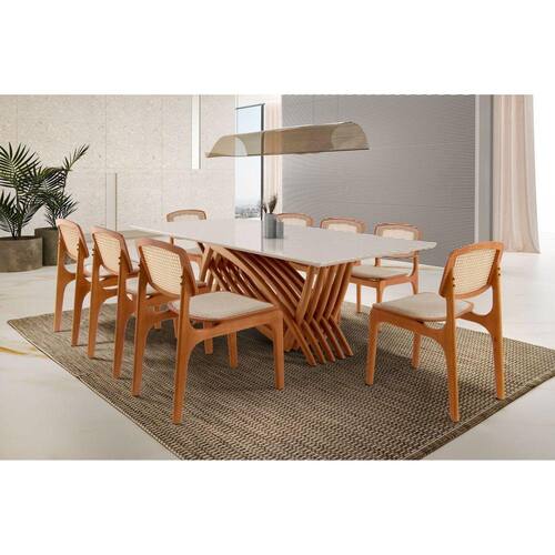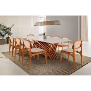Mesa de madeira maciça tauari, com tampo canto moeda laqueado off white e vidro serigrafado off white temperado. Cadeira de madeira maciça tauari, com assento em espuma D26 revestido em tecido linho e encosto em tela natural. Medida da Mesa (A x L x P): 80 x 220 x 110 Peso da Mesa: 118,5 kg Mesa suporta até: 80 kg Acabamento da Cadeira/Banco: Pintura Acabamento da Mesa: Verniz Acompanha Manual de Instalação: Não Almofada do assento: Fixa Altura do Conjunto: 86 cm Ambiente Principal: Sala de Jantar Cadeira/Banco estofada: Somente Assento Estofado Cadeira/Banco suporta até: 120 kg Complexidade da Montagem: Média: pode ser montado por mais de uma pessoa e/ou necessite de maior conhecimento para montagem Cor: Off White/ Imbuia Natural Cor da Base: Marrom Cor do Produto: Off White/ Imbuia Natural Cor do Tampo: Off White Cor Flex: Não Cor Secundária: Branco De Canto (Canto Alemão): Não Design da Base: Trenó Enchimento do Encosto: Espuma D-18 Escala de Brilho: Fosco Espessura do Tampo: 40 mm Espessura do Vidro: mm Estrutura do Assento: Lâmina de madeira cinamomo. 15mm Estrutura do Encosto: Lâmina de madeira cinamomo. 15mm Formato do Tampo: Retangular Informações Complementares: Conjunto com um designer super moderno com muita qualidade e conforto Itens Inclusos: 1 Mesa com 8 Cadeiras Linha ou Coleção: Zurick com Maia Premium Manual de Montagem e Instalação: https://product-hub-prd.madeiramadeira.com.br/898057/documents/0caa1273-669f-476d-9eb0-6c0d323fe2478044715521manualdemontagem.pdf Material da Base da Mesa: Madeira Maciça Material da Estrutura da Cadeira: Madeira Maciça Material do Tampo: Madeira Maciça Material Principal: Madeira Maciça/Vidro Material Principal das Cadeiras/Bancos: Madeira Maciça Medida da Base (A x L x P): 78 x 52 x 140 Medida da Cadeira/Banco (A x L x P): 86 x 46 x 55 Medida do Canto Alemão (A x L x P): Não Possui Medida do Tampo (L x C x E): 220 x 110 x 4 Mesa Dobrável: Não Mesa Extensível: Não Montagem Flex: Não Necessita Montagem: Sim Origem do Produto: Nacional Peso da Cadeira/Banco: 6 kg Possui Apoio para Braços: Não Possui Apoio Para os Pés: Não Possui Prateleiras: Não Possui Rodízio: Não Possui Suporte Giratório: Não Possui Vidro: Sim Quantidade de Cadeiras: 8 Quantidade de Lugares: 08 Recomendações de Uso, Manutenção e Limpeza: Limpar com pano seco Sistema de Montagem: Parafusos Tipo de Assento: Fixo Tipo de Encosto: Fixo Tipo de Madeira Maciça da Base da Mesa: Tauari Tipo de Madeira Maciça do Tampo: Tauari