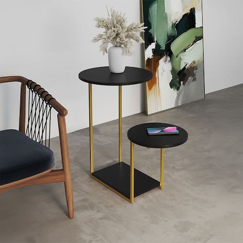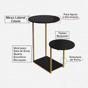 Características: Modelo: Mesa Lateral Cibele Material da Estrutura: Ferro Material do Tampo: MPD Formato: Redondo Cor do tampo: Preto Cor da estrutura: Dourado Design moderno e funcional