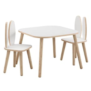 Lindo kit de mesa e duas cadeiras modelo coelho.Kit no mdf branco tx com pés no pinus cru.Mesa: altura de 42 cm e tampo 52x52 cm.Cadeiras: altura de 27 cm e assento 25x22cm. Marca: Store Kids