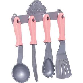 Conteúdo - Mesinha + 1 chaleira, 1 panela, 1 frigideira, 4 utensílios e 1 suporte