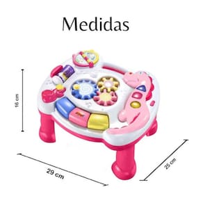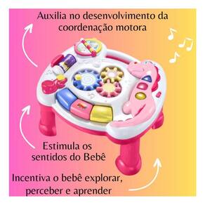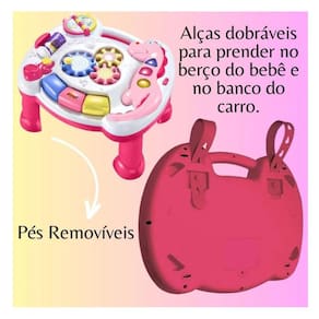 Com a Mesa de Atividades vire a página do livrinho que será reproduzido o som do animal que aparece na imagem, ao mesmo tempo em que luzes coloridas piscam no dragãozinho. Aperte o botão localizado na lateral, que a imagem do cilindro muda para noturna ou diurna e um som correspondente é emitido enquanto luzes coloridas piscam no dragãozinho. O sax reproduz duas diferentes melodias enquanto luzes piscam no ritmo da música. Aperte as teclas para acionar as luzes e ouvir as notas DÓ, RÉ e MI, quando essas são emitidas uma melodia começa. São duas canções diferentes; Gire o mecanismo no meio do brinquedo para ouvir diferentes melodias, continue girando para completar a música enquanto luzes coloridas piscam no dragãozinho. Características gerais: - Possui elementos que vão ajudar os pequenos a desenvolver suas habilidades: motora, auditiva e visual. - Desenvolvida com material de excelente qualidade - Possui pernas removíveis e alças dobráveis para prender no berço do bebê e até 12 opções de diversão. Especificações:Alimentação: 3 pilhas AA inclusas. Marca: Zoop Toys Modelo: Mesa de atividades Código: ZP01041 Material: Plástico Idade recomendada: + 6 Meses Cor: Rosa Certificação InmetroGarantia: 3 meses contra defeitos de fabricação.Dimensões da embalagem: 26 X 8 X 37 (A X L X C) Peso: 600g