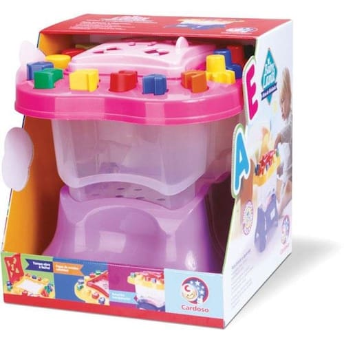 Mesinha de atividades para estimular a coordenação motora, o aprendizado e a diversão da criança. Encaixes geométricos, tampa abre e fecha, engrenagens, números e letras.