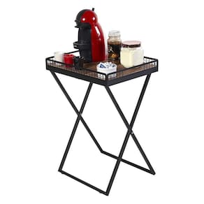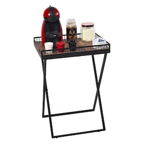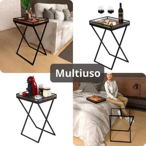 Mesinha dobrável para canto do café com bandeja preto fosco O conjunto du gard é uma mesa dobrável com bandeja removível que inspira-se em proporções e traços graciosos que trazem um aspecto leve e uma simplicidade majestosa. Conjunto du gard é super versátil podendo ser utilizado de várias formas, como um cantinho de café, uma mesa para aquele gostoso happy hour ao lado do sofá com seus convidados, uma maravilhosa degustação de vinho ou servir aquele café da manhã no aconchego de sua cama, pois a bandeja é removível podendo ser levada para qualquer lugar do seu lar. Além de sua versatilidade, é super prática pois sua base é dobrável, ficando supercompacta para guardar ou transportar. BenefíciosÉ um móvel multiuso, ideal para compor salas, cozinha, quartos, cantinho do café, escritórios, recepções, sem contar o toque especial na da decoração do ambiente. Conjunto tem seus contornos du gard e com acabamento amadeirado, tornando um móvel muito sofisticado. Bandeja removível podendo ser utilizada de forma separada para servir drinks no sofá, café da manhã na cama ou transportar pratos de forma segura. Compacta, utilize ao lado de sofás, cabeceiras de camas sem ocupar grandes espaços. Base dobrável, guarde em pequenos espaços. Especificações técnicaAcabamento: pintura eletrostática epóxiCor: preto foscoMaterial estrutura da base: tubo de aço 15x15mm com proteção anti-ferrugemMaterial da bandeja: aço com proteção anti-ferrugem e madeira.Requer montagem: nãoPeso suportado: 20kg Medidas da bandejaLargura: 48cmProfundidade: 37cmAltura: 6.5cm Medidas da baseLargura: 41cmProfundidade: 37cmAltura:63cm Conteúdo da embalagem1 un - bandeja1 un - base dobrável para bandeja Atenção: os objetos que ambientam as fotos não acompanham o produto.