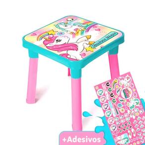 Unicórnio Mesinha Com Cadeira e Cartela de Adesivos   Unicónio Mágico Minha Mesinha c/ cadeira da Monte Libano. É uma Mesinha com cadeirinha desmontável. A mesinha é para todas as atividades da criança. A mesa possui um cenário lindo do personagem Unicónio Mágico para as crianças brincarem e criarem tudo o que a imaginação mandar! A grande surpresa é a cartela de adesivos que a criança vai poder brincar e interagir com seus amigos. A mesa infantil com cadeira tem tampo removível para guardar objetos.   Informações: - Recomendado para crianças maiores de 03 anos - Referência: MI5070 - Produto: Mesinha com cadeira e 1 cartela de adesivos - Medidas Cadeira Aproximadamente: 45x23x32cm - Medidas Mesa Aproximadamente: 47x49x49cm   Contém: - 1 Mesinha - 1 Cadeirinha - 1 Cartela de Adesivos