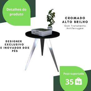 Mesinha Lateral De Canto Para Sala e Quarto Redonda C.P A Mesinha de Canto Evidence é ideal para compor salas e quartos, pois seu projeto utilizam madeira e aço, o que a torna atemporal com muita versatilidade na hora de combinar cores e outros elementos para os mais diferentes estilos decorativos. Querendo uma Mesinha de Canto Exclusiva e diferente do que há no mercado para você arrasar na decoração O grande charme são os traços de seus pés com estilo retrô, fabricados em aço resistente e durável, já que recebem um lindo acabamento cromado dando um Alto Brilho, para evidenciar o tampo de madeira. Mesinha de Canto é super versátil podendo ser utilizada para colocar copos e xícaras, apoiar controles remotos, descansar livros e óculos, deixar o celular carregando, expor as bebidas, apoiar a luminária ou o abajur e entre outros. BENEFÍCIOSAcabamento PremiumResistenteQualidade garantida com Corte a Laser do AçoCromado com tratamento anti-ferrugemBatoque Emborrachado nos pés para não riscar o piso ou escorregarDesigner Exclusivo e Inovador dos Pés ESPECIFICAÇÕES TÉCNICAPeso Suportado: 35KgMaterial dos pés: AçoMaterial do Tampo: Madeira MDP 15mmAcabamento da Estrutura dos pés: CromadoCor dos pés: Alto BrilhoCor do Tampo: PretoRequer Montagem: SimNível de Dificuldade de montagem: FácilConteúdo da Embalagem: 1 Mesa de Canto MEDIDAS:Diâmetro do Tampo: 45CmAltura dos pés: 50CmAltura Total: 51.8cm