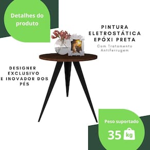 Mesinha Lateral De Canto Para Sala e Quarto Redonda P.M A Mesinha de Canto Evidence é ideal para compor salas e quartos, pois seu projeto utilizam madeira e aço, o que a torna atemporal com muita versatilidade na hora de combinar cores e outros elementos para os mais diferentes estilos decorativos. Querendo uma Mesinha de Canto Exclusiva e diferente do que há no mercado para você arrasar na decoração O grande charme são os traços de seus pés com estilo retrô, fabricados em aço resistente e durável, já que recebem uma camada de proteção contra ferrugem com acabamento de pintura eletrostática epóxi, para evidenciar o tampo de madeira. Mesinha de Canto é super versátil podendo ser utilizada para colocar copos e xícaras, apoiar controles remotos, descansar livros e óculos, deixar o celular carregando, expor as bebidas, apoiar a luminária ou o abajur e entre outros. BENEFÍCIOSAcabamento PremiumResistenteQualidade garantida com Corte a Laser do AçoPintura Eletrostática Epóxi com tratamento anti-ferrugemBatoque Emborrachado nos pés para não riscar o piso ou escorregarDesigner Exclusivo e Inovador dos Pés ESPECIFICAÇÕES TÉCNICAPeso Suportado: 35KgMaterial dos pés: AçoMaterial do Tampo: Madeira MDP 15mmAcabamento da Estrutura dos pés: Pintura Eletrostática EpóxiCor dos pés: Preto FoscoCor do Tampo: AmadeiradoRequer Montagem: SimNível de Dificuldade de montagem: FácilConteúdo da Embalagem: 1 Mesa de Canto MEDIDAS:Diâmetro do Tampo: 45CmAltura dos pés: 50CmAltura Total: 51.8cm