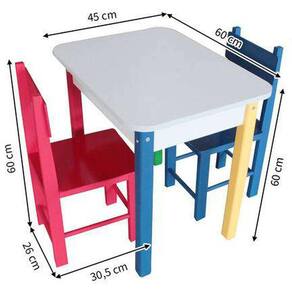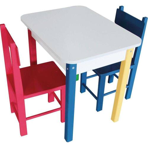 Conjunto de mesa e 02 cadeiras. Mesa confeccionada em madeira e M.D.F.Mesa retangular com borda colorida.Pés coloridos pintados com tinta atóxica, nas cores vermelho, verde, azul e amarelo.Acompanha 2 cadeiras coloridas de madeira nas cores verelha e azul .Medida cadeira: 26 x 30,5 x 60 cm.Medidas da mesa: 60 x 45 x 56,5 cm.Embalagem caixa de papelão.