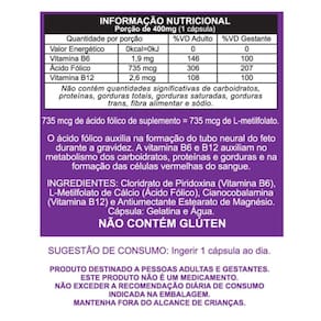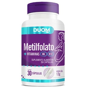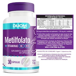 Metilfolato com vitaminas b6 e b12 com 30 cápsulas - duom Metilfolato com vitaminas b6 e b12 com 30 cápsulas - duom - descrição - indústria do corpoO ácido fólico auxilia na formação do tubo neural do feto durante a gravidez. A vitamina b6 e b12 auxiliam no metabolismo dos carboidratos, proteínas e gorduras e na formação das células vermelhas do sangue. - benefícios - indústria do corpo- 735 mcg de ácido fólico de suplemento = 735 de l-metilfolato;- enriquecido com vitamina b6;- enriquecido com vitamina b12;- sem adição de açúcares;- não contém glúten. - sugestão de uso - indústria do corpoIngerir 1 cápsula ao dia. - tabela nutricional -Em anexo nas imagens. - composição - indústria do corpoEm anexo nas imagens. - recomendações - indústria do corpoEm anexo nas imagens. - dados técnicos - indústria do corpoMarca - duom.Conteúdo líquido por frasco - 30 cápsulas.Rendimento por frasco - 30 doses/porções.Peso líquido por frasco - 15g.Peso bruto por frasco - 45g.Peso aproximado produto + embalagem - 100g.Código de barras (ean) - 7898665752210.Registro anvisa - dispensado de registro de acordo com a resolução da rdc 27/2010 e rdc 240/2018 da anvisa.Dimensões do produto - largura: 6,5 cm; altura: 11,5 cm; comprimento: 6,5 cm.Dimensões da embalagem/pacote - largura: 13 cm; altura: 7 cm; comprimento: 16 cm. - itens do anúncio - indústria do corpo1 unidades do produto:Metilfolato com vitaminas b6 e b12 com 30 cápsulas - duomTotal - 30 cápsulas por frasco.