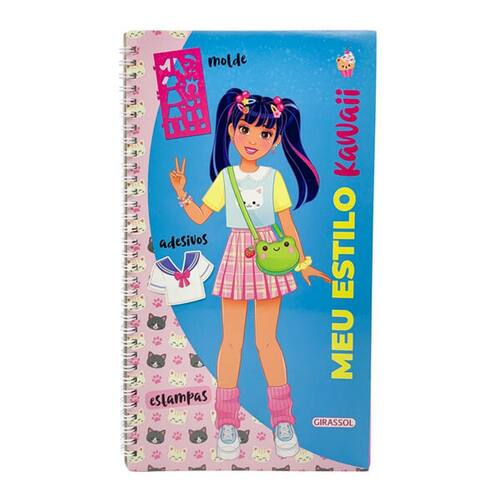 Desenhe sua própria coleção! Que tal desenhar e criar os looks que sempre sonhou? Escolha a estampa, e então use o molde para desenhar roupas fabulosas. Depois é só recortar e colar no modelo de manequim que quiser. Você ainda pode colorir e completar com adesivos para dar seu toque especial à sua coleção KAWAII!