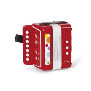 O acordeão possui 7 teclas para notas musicais, 2 teclas para mudanças de tom e 1 tecla para soprar o ar, tudo pensado para estimular a coordenação motora, concentração e percepção auditiva da criança.