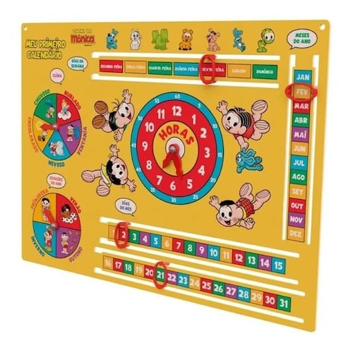 Com o Meu Primeiro Calendário Turma da Mônica as crianças irão se divertir movendo os ponteiros, indicando os dias da semana e os meses do anoPreço por UnidadeCaracterísticas• Possui dois furos no calendário para pendurar• Dimensões: 28,8 cm (Largura) x 38,5 cm (Comprimento)• Material: Madeira Reflorestada / Ponteiros do Relógio: Plástico e metalObservação• Possui certificação Inmetro CE-BRI/IQB - 5923• Recomendado para crianças maiores de 5 anos• Não recomendável para crianças menores de 3 anos por conter partes pequenas que podem ser engolidas ou aspiradasINFORMAÇÕES IMPORTANTES:- A(s) cor (es) dos produtos podem sofrer variação de tonalidade, de acordo com a configuração do seu dispositivo ou monitor.- O prazo de entrega informado no anúncio é apenas uma previsão, podendo sofrer alterações na data de entrega informada no ato da compra por motivo de força maior.