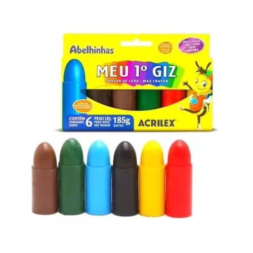 Giz Cera Acrilex Meu Primeiro Giz C6 Cores 185g, foi desenvolvido para trabalhos infantis, em formato anatômico que facilita a pegada e ajuda no desenvolvimento da motricidade da criança.Seu grande diferencial é a facilidade no manuseio. Para desenhar, escrever e pintar sobre papel, cartolina, papel cartão e trabalhos com acabamentos artísticos