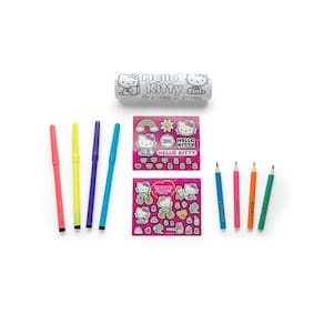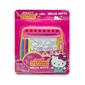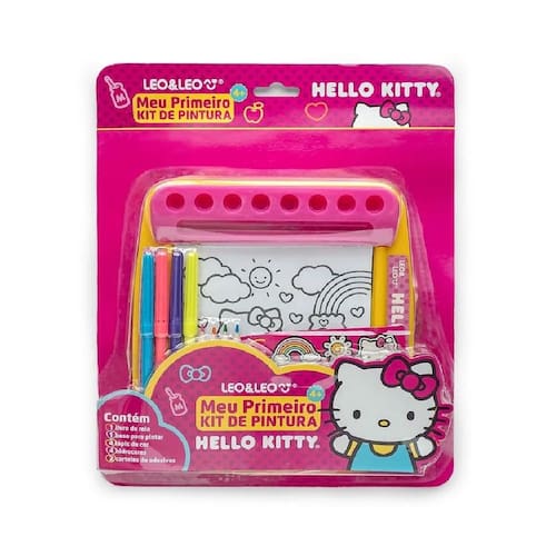 -O Meu Primeiro Kit de Pintura Hello Kitty contém um livro de rolo de 3m com ilustrações para colorir. Vem também com 4 hidrocores, 4 lápis de cor tamanho mini, 2 cartelas de adesivos temáticas e um suporte para apoiar o papel e as canetinhas. São diversos itens que vão estimular a criatividade e a concentração.