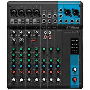 DESCRIÇÃO MG10 Mixer analógico de 10 canais: 10 entradas (4 mono/mic + 3 stereo) / 1 barramento estéreo e 1 AUX. A nova mesa de som MG10 Standard é lançamento da Yamaha, que está apresentando a 3° geração da série MG. É uma ótimas opções para quem quer um equipamento extremamente portátil com a qualidade consagrada da Yamaha. Atualize seu setup contando com equipamentos de áudio com recursos e de qualidade. Para um controle mais preciso e valorização do seu som, os modelos da série XU MG vêm equipados com um conjunto de renomados efeitos SPX da Yamaha. Com alta resolução, Chorus, Flanger, Distorções, Reverb e Delay, todos com os parâmetros editáveis, estes são os mesmos processadores Multieffects utilizados em high-end mesas de mistura da Yamaha, dando-lhe as ferramentas que você precisa para elevar suas mixagens para um plano superior. CARACTERÍSTICAS MG10 - Mixer de 10 canais; - 4 entradas de microfones / 3 entradas estéreo; - 1 Barramento estéreo; - 1 Saída AUX; - Pré amplificadores ?D PRE? com circuítos Darlington invertido; - Compressores de 1-Knob (canais 1 ao 4); - Atenuador de 26 dB (canais 1 ao 4); - Alimentação: Fonte de alimentação externa. PA10 (120 Volts); - +48V phantom power (canais 1 ao 4); - Conectores de saída XLR balanceados; - Chassis de metal; - Resposta de frenquência: 20Hz - 48kHz; - Chaves para Phantom power e PAD Switch; - Chassis de metal; - Dimensões (W×H×D): 244mm x 71mm x 294mm; - Peso: 1,9kg. Obs.: As informações e fotos deste produto são fornecidas pelo fabricante, sendo inteiramente de sua responsabilidade. Vendas Rápidas é Distribuidor Yamaha