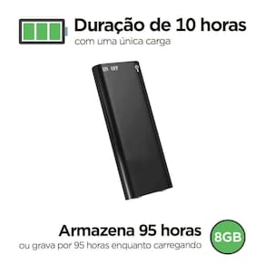 Sua bateria potente consegue gravar áudios por até 10 horas seguidas antes que seja necessário recarregá-la. Já utilizando o Gravador conectado a energia, consegue chegar a incríveis 95 horas de áudio, o mesmo serve para o armazenamento dentro da memória interna de 8GB.