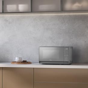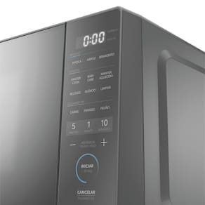 Funções MasterCook (desidratar, cozinhar, assar, ao vapor, derreter, fermentar), MasterClean (revestimento antiaderente), Função Limpa Fácil, 10 Níveis de Potência, Função Baby Care, Função Manter Aquecido, Função Descongelar (carne, frango, feijão), Receitas Pré-Programadas (Pipoca, arroz, brigadeiro), Sistema Toque Rápido (+30 segundos), Desodorizador, Porta espelhada, Puxador embutido, Display Digital branco, Prato Giratório Inteligente, Temporizador Máximo: 99 minutos / 99 segundos, Potência Nominal: 1050W, Classe de Eficiência Energética: A, Material Interno: Metal (cor cinza escuro), Material Externo: Metal, Plástico e Vidro.Função Grill