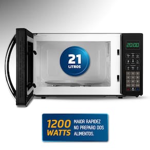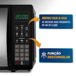 Micro-ondas Mondial 21 litros compacto com 10 níveis de potência, funções Tira Odor, Descongelar, Manter Aquecido, Menu Kids e Dia a Dia, prato giratório, tecla Iniciar Fácil de 30 segundos e trava de segurança.Função Grill