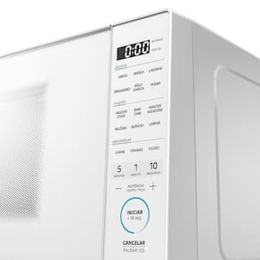 Função MasterCook com 6 funções (aquecer, desidratar, cozinhar, assar, ao vapor, derreter e fermentar), Tecnologia MasterClean (revestimento interno antiaderente), Função Limpa Fácil, Tecnologia Smart Plate (prato giratório retorna à posição inicial), Função Descongelar (carne, frango, feijão), Função Manter Aquecido (até 5 minutos), 10 Níveis de Potência, Função Baby Care (esterilização), Receitas Pré-Programadas (Pipoca, arroz, brigadeiro, bolo de caneca, lasanha, pudim), Sistema Toque Rápido (+30 segundos), Design Moderno com puxador embutido, Display Digital branco, Desodorizador.Função Grill