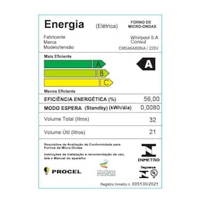 Características do Produto: Modelo: CMS46AB Marca:Consul Cor: Branco Altura: 30,1 Largura: 53,8 Comprimento/Profundidade: 39,1 Peso: 16 Kg Capacidade: 32 Litros Potência útil: 900 Frequência: 60 Hz Plugue e tomada: 10 A,20 A Alimentação: Dísponível em 110V ou 220V