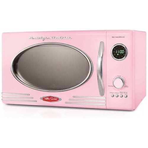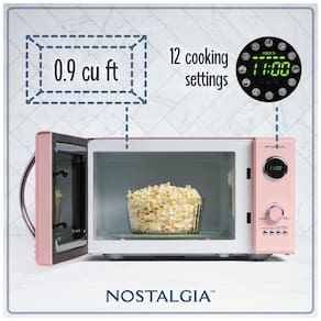 Potência de cozimento de 800 watts Com 25 Litros, este micro ondas fornece a potência de cozimento necessária para cozinhar e reaquecer alimentos rapidamente. Configurações de cozimento personalizáveis 12 configurações de cozimento pré programadas e temporizador de atraso fornecem opções para o aquecimento ideal de alimentos populares como pipoca, pizza, batatas, legumes e muito mais. Relógio digital O display LED de fácil leitura acende o relógio digital e destaca cada configuração de cozimento. Cozinhar uniformemente o carrossel de vidro giratório ajuda a cozinhar os alimentos uniformemente. Acentos retrô Uma maçaneta cromada elegante, painel de controle e detalhes adicionam diversão e elegância a este aparelho exclusivo de estilo retrô