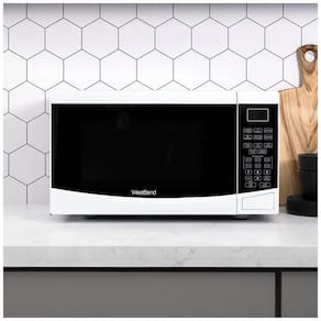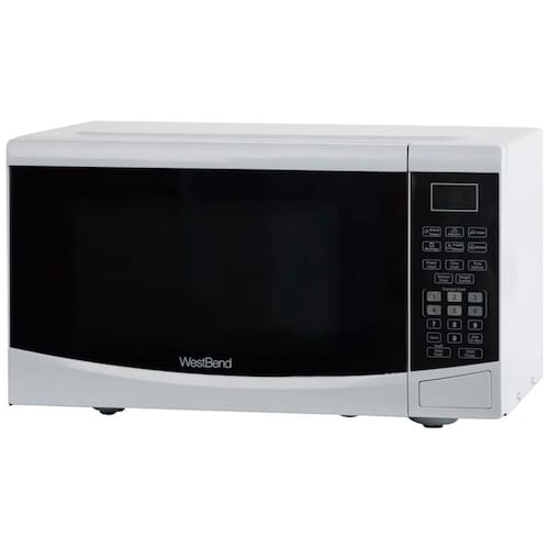Micro-ondas de bancada West Bend 25L, 900W, 110V, com 6 programas pré-definidos, funções de descongelamento, níveis de potência variáveis, prato giratório e trava de segurança para crianças.Função Grill