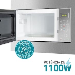 Micro-ondas de embutir, 28L de capacidade total (14L útil), 1400W de potência, Prato giratório de 28,5 cm, Pintura interna Limpa Fácil, Display digital, Função Descongelar por tempo ou peso, Função +30 segundos, Função Cozinhar por tempo ou peso, Função Manter Aquecido, Função Tira Odor, Função Travar, Receitas pré-programadas (Lasanha, Menu Fit, Pizza, Pipoca, Brigadeiro, Bolo de Caneca).Função Grill