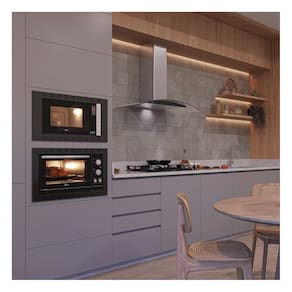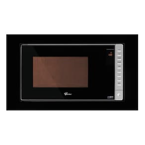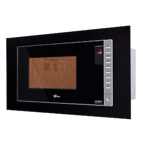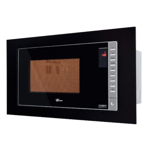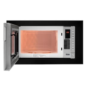 Micro-ondas de embutir com 25 litros de capacidade, 5 níveis de potência, grill (não), lâmpada (sim), painel digital, timer, relógio 24 horas, trava de segurança, descongelamento por tempo e peso, automenu com 8 opções. Acabamento em aço inox e porta com vidro preto.Função Grill