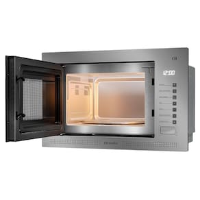 Micro-ondas de Embutir Mueller 25 L Espelhado (MME25K): acabamento sofisticado com vidro espelhado + inox, capacidade de 25 litros, potência total de 1450 W, painel digital touch com 5 níveis, função descongelar por tempo ou peso, timer com aviso sonoro, luz interna. Elegância e praticidade para sua cozinha planejada.