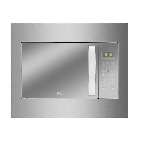 Micro-ondas de embutir Philco com capacidade de 37 litros, potência de 1400W, design espelhado e funções pré-programadas como brigadeiro, pipoca, lasanha, pizza, bolo de caneca e menu fit. Possui pintura Limpa Fácil e classificação energética A.Função Grill