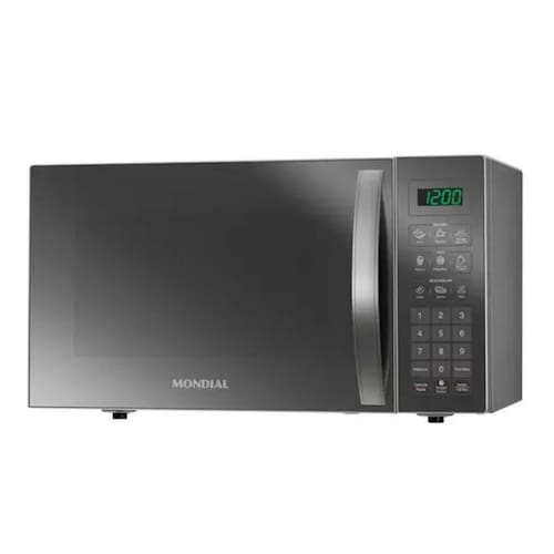 Micro-ondas Mondial 34 litros com potência de 1400W, modelo espelhado, 10 níveis de potência, função tira odor, menu dia a dia, menu kids, função manter aquecido e função descongelar.Função Grill