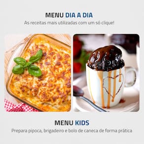 Micro-ondas Mondial 34 litros, 1400W de potência, funções Menu Dia a Dia e Menu Kids, função descongelar, função manter aquecido, 10 níveis de potência, função tira odor, trava de segurança e selo de eficiência energética A.Função Grill