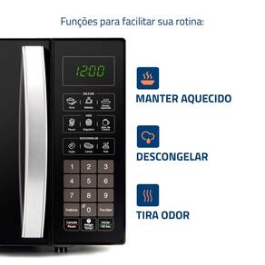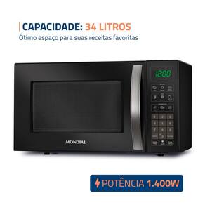 Micro-ondas Mondial com capacidade de 34 litros, 1400W de potência, display digital, funções Menu Dia a Dia, Menu Kids, descongelar, manter aquecido, tira odor, 10 níveis de potência e trava de segurança.Função Grill