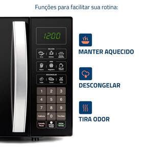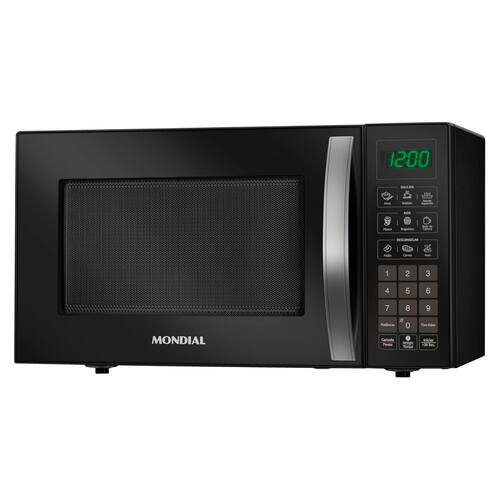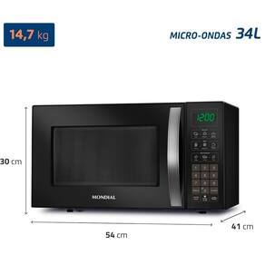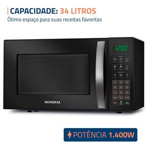 Micro-ondas Mondial 34L com 1400W de potência, Menu Dia a Dia, Menu Kids, função descongelar, função manter aquecido, 10 ajustes de potência, função tira odor e trava de segurança.Função Grill