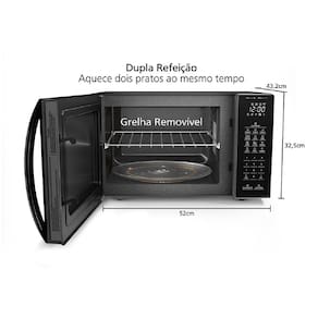Sabe quando você vai almoçar com alguém e precisa esperar um prato ficar pronto pra esquentar o outro? A Dupla Refeição foi criada para resolver situações como essa. Com uma grelha removível, a função pode ser ativada pra aquecer 300 g, 500 g e 700 g (peso total das duas porções) em pratos diferentes. Pra aproveitar, basta colocar uma refeição no prato giratório e outra na grelha.