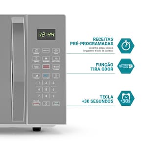 Micro-ondas com capacidade de 25 litros, 6 receitas pré-programadas, funções tira odor e manter aquecido, classificação energética A, potência de 1100W.Função Grill