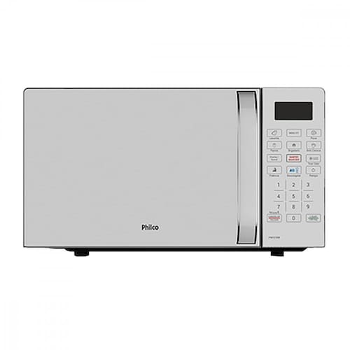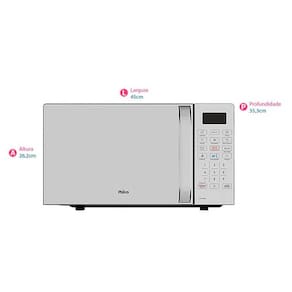 Micro-ondas Philco PMO23BB com 20 litros de capacidade, 1100W de potência, funções de descongelamento, tira odor, função display, função relógio e eficiência energética Classe A.Função Grill