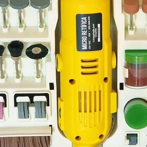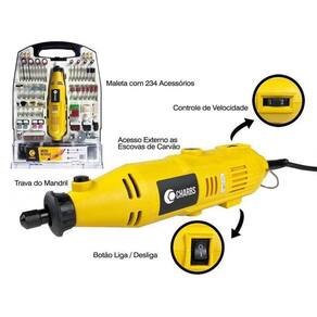 Micro Retífica com 234 Acessórios e Maleta Mini Furadeira Voltagem: 220V Micro Retífica com 234 Acessórios e Maleta Mini Furadeira Mini Retífica Charbs é a ferramenta ideal para trabalhos de desbaste, remoção, limpeza, polimento, gravação, lixamento e furação de diferentes tipos de materiais e superfícies. Tenha em mãos um kit que reúne tudo o que você precisa em uma exclusiva maleta portátil para você levar onde for - Marca: Charbs - Modelo: CH2904x - Potência: 135W - Frequência: 60 Hz - 6 Velocidades - Velocidade Variável entre 8.000 e 30.000 Rpm - Acompanha maleta e 234 acessórios - Isolação Dupla - Peso bruto: 1,53Kg - Garantia: 90 dias Itens inclusos: - 1 Micro Retífica Charbs - 6 Pinças - 8 Tubos de Lixa - 3 Brocas - 9 Pontas diamantadas - 2 Suporte para discos de corte - 1 Suporte para disco de polimento - 2 Suportes para tubos de lixa - 3 Escovas de nylon - 3 Escovas de metal - 10 Pontas montadas - 1 Frasco com paste de polimento - 7 Discos de polir - 14 Discos de desbastar - 90 Discos de lixa - 65 Discos de corte - 5 Discos de corte reforçados - 1 Pedra de amolar - 1 Chave de troca - 1 Ponta para plir Um ou outro acessório pode variar de acordo com o lote