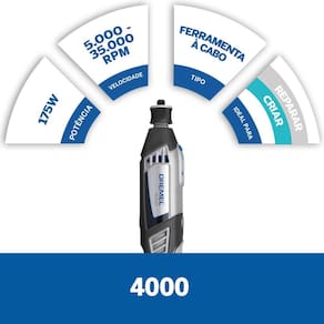 A Micro Retífica Dremel 4000 é a ferramenta para quem busca praticidade e precisão. Com 8 aplicações diferentes em uma única máquina, ela é perfeita para quem trabalha com corte, lixamento, limpeza, polimento, escultura, gravação, esmerilhamento, afiação, fresagem e furação.