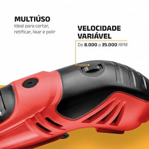 VELOCIDADE VARIÁVEL: A velocidade variável de 8.000 a 35.000 RPM oferece controle total para qualquer tarefa. Você pode ajustar conforme o material e a aplicação, garantindo precisão em cortes, lixamentos, gravações e polimentos.