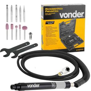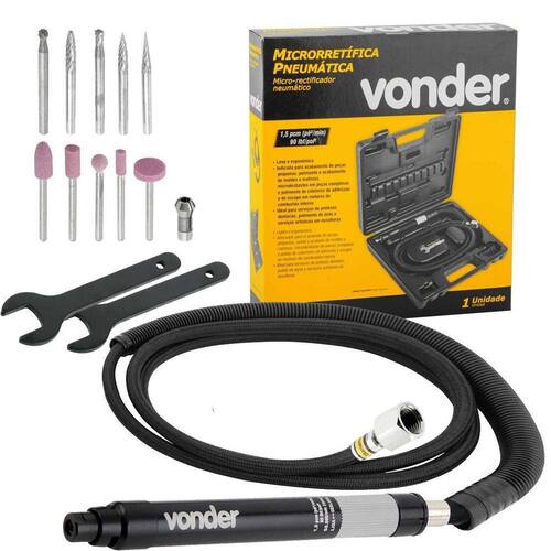 - marca: vonder - código: 62.57.018.016 - consumo de ar: 1,5 pcm pé/min - pressão de trabalho 90 lbf/pol2 - velocidade: 56.000 rpm - rosca de entrada 1/4 npt fêmea - comprimento da mangueira 1,45m - diâmetro da caneta: 15,5 mm - comprimento da caneta: 140 mm - nível de vibração 2,4 m/s2 - incerteza k 0,73 m/s2 - uso industrial - 2 pinças 1/8 e 3,0 mm - peso da caneta: 100 g - garantia: 90 dias