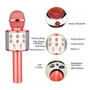 Microfone bluetooth wster ws-858 sem fio karaokê - rose gold Este microfone portátil conta com uma caixa de som embutida nele, com ele você pode simplesmente cantar e ter sua voz amplificada nos alto-falantes assim além de poder sincronizar seu celular ou notebook via bluetooth e reproduzir um playback e cantar junto, ou simplesmente deixar ele tocar como uma caixa de som portátil. Existe ainda a opção de conectar este microfone em uma caixinha de som ou caixa amplificada através do cabo auxiliar p2 e cantar alto pra valer com o som saindo em alto-falantes externos potentes