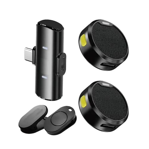 Microfone duplo de lapela sem fio 2.4G, Plug and play, transmissão de áudio sem perdas, redução de ruído, alcance de 20m, duração de 48h de uso contínuo, carregamento total em 2h.Tipo