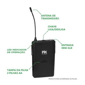 Com o microfone sem fio Px-1000a, você tem a melhor experiência em som profissional. Com 2 microfones Sem fio tipo , frequências individuais com alcance de até 60 metros, Fácil instalação e controles de volume individuais por canal, essa é a opção Ideal para apresentações, cultos, karaokês, palestras e eventos. Uhf compacto com 2 microfones lapela / headset e controles de volume individuais. - alta relação sinal-ruído - distorção super baixa - amplo alcance: até 60 metros em circunstâncias ideais, 15 metros de raio em condições normais. Microfone/transmissor - potência do transmissor: 30mw - emissão de espúrios: 40db - display: led - voltagem de bateria 1.5v x 2 - vida útil da bateria: até 8 horas - anatel: 16222-20-13478 Atenção: Não utilizar mais de 1 microfone modelo e frequência no mesmo ambiente, pois dará interferência no sinal. Especificações técnicas: Microfone sem fio e 2 microfones de headset/ lapela 595,10 632,10 mhz Homologação Anatel: 110052213346