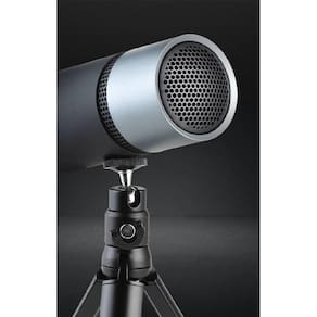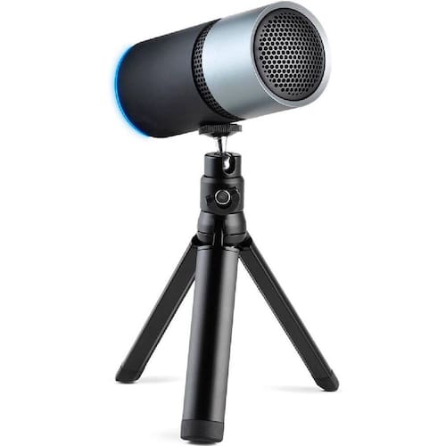 CARACTERÍSTICAS TÉCNICAS Cardioid Tripé ajustável 360º Altura e ângulo ajustáveis USB LED Indicativa Funções: Na parte traseira do microfone temos o controle de volume, o botão mudo para ativar e desativar o áudio quando quiser, e uma entrada 3,5 mm para canal de retorno.
