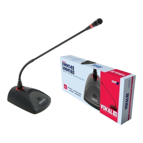 Características Gerais:- MICROFONE VMM-145Aplicações:- Reuniões e conferênciasEspecificações técnicas:- Haste articulável- Chave Liga/desliga- Led Power na Haste e na base- Corpo da base plástico com peso de metal (ótima estabilidade)- Microfone tipo condenser- Alta sensibilidade- Espuma anti puff- Sensibilidade: -43dB +-2dB (0dB=1 V/PA em 1kHz)- Resposta de frequência: 40 16kHz- Máx. SPL: 136 dB (em 1kHz = 1% T.H. D)- Saída XLR balanceada- Microfone gooseneck- Haste: 45 cm com dupla articulaçãoCapsula:- Tipo: Eletreto condenser- Padrão polar: Cardioide uni direcional- Impedância de saída: 2K ohms +- 30% em1kHz- Tamanho da capsula: 10 mm- Espuma anti puffAlimentação:- 2 x pilhas AA 1,5Volt (inclusas)Obs.: (O compartimento das pilhas está localizado na parte debaixo da base)