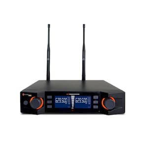 Frequência: 614.200 – 669.700MHz Grupos programados: 9 grupos com 9 canais de frequências Alcance dinâmico: 90dB Alimentação: DC12V 1A Saídas XLR balanceadas A e B Saída P10 para mix canal A+B Duplo microfone de mão – Handhell Sincronização através de IR Distância entre TX e RX: 30M Display em LCD com informações básicas (Frequência, Grupo, Canal, AF, RF, aviso de pilhas com baixa carga) Antenas Omnidirecional 1/2 comprimento de onda, BNC