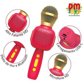 O Microfone Karaokê é muito divertido Conecte o seu smartphone e cante junto as suas músicas preferidas Com efeitos de voz para você brincar com amigos Possui entrada para cartão de memória SD e é recarregável.