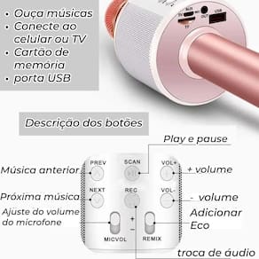 Conexão Bluetooth: Conecte facilmente o microfone ao smartphone, tablet ou dispositivo Bluetooth para reproduzir músicas de karaokê favoritas. Alto-falante Integrado: Equipado com um alto-falante integrado de alta qualidade, proporcionando um som nítido e claro para as performances das crianças. Bateria Recarregável: Possui uma bateria recarregável que oferece horas de uso contínuo, garantindo diversão sem interrupções durante as festas de karaokê. Controle de Volume e Eco: Ajuste facilmente o volume e o efeito de eco do microfone para criar o ambiente de karaokê perfeito para as crianças soltarem a voz. Design Durável e Seguro: Construído com materiais duráveis e seguros para crianças, garantindo resistência e proteção durante o uso.