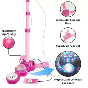 Indicado para crianças a partir de 3 anos, o microfone com pedestal oferece uma experiência interativa e imersiva. Além disso, cantar no microfone pode ajudar a desenvolver a confiança, a expressão pessoal e as habilidades de comunicação das crianças. As luzes coloridas giratórias tornam a experiência ainda mais emocionante, trazendo a atmosfera de um verdadeiro show.