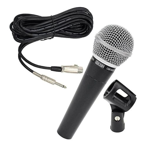 Microfone CSR SM58 Profissional dinâmico unidirecional O modelo da SM 58 da CSR é um microfone dinâmico unidirecional ideal para vozes , gravações e ensaios de estúdio. Este modelo acompanha case, cabo de 4,5 metros e . Características: CSR SM 58 Microfone Profissional Dinâmico Polaridade: Unidirecional Resposta: 60Hz15KHz Impedância: 250 Ohms Com Transformador Interno Sensibilidade: -72dB Modelo: CSR SM 58 Não possui chave liga/desliga Marca: Não Informado